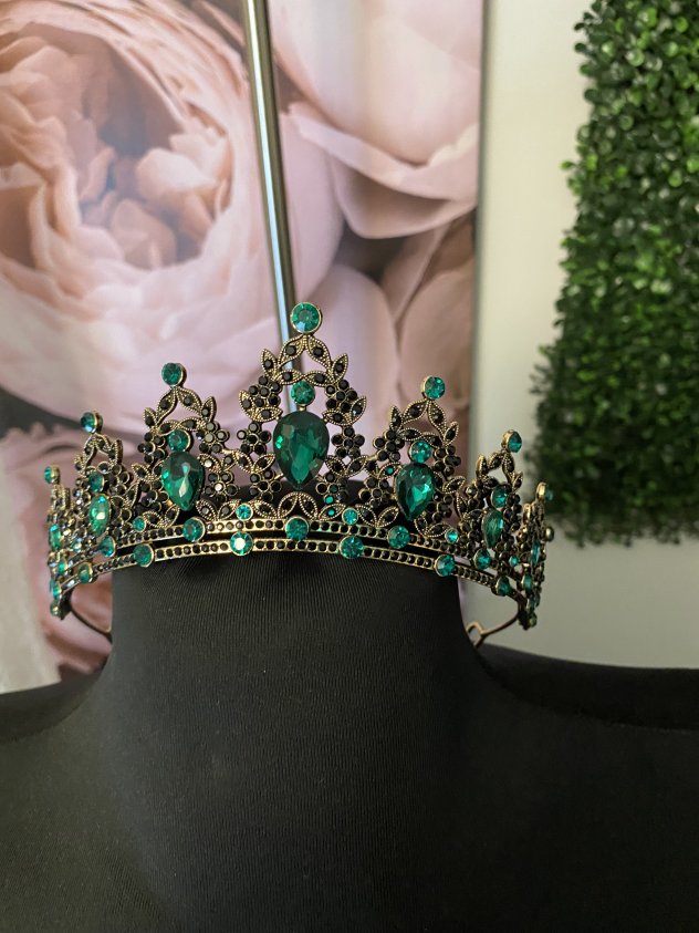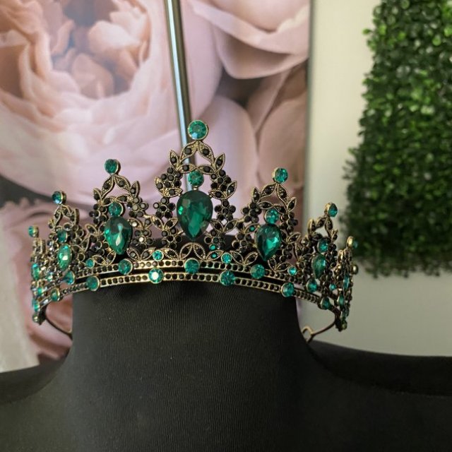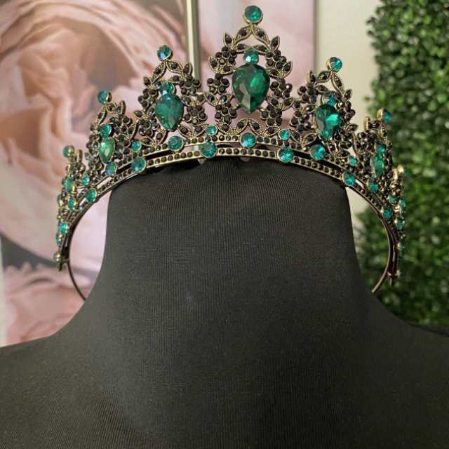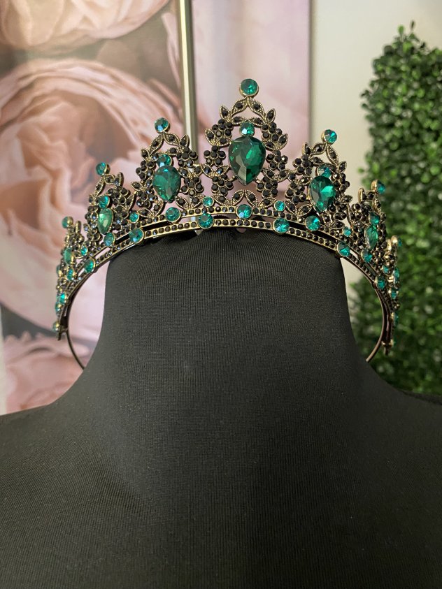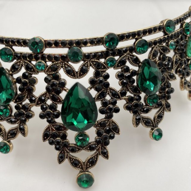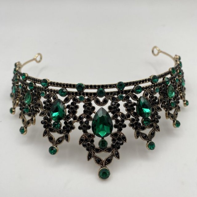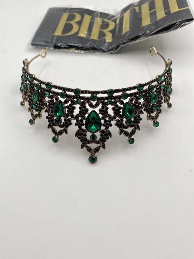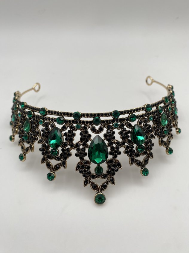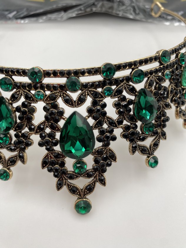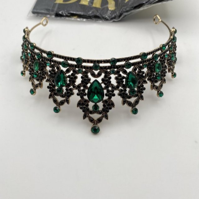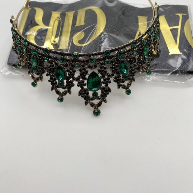 This elegant headpiece features emerald green crystals set in a gold-tone metal design with detailed dangling accents. It’s perfect for weddings, proms, costume events, photo shoots, or themed parties. Lightweight and comfortable to wear, with an open back for easy fitting. A standout accessory that adds a dramatic, vintage-inspired look.