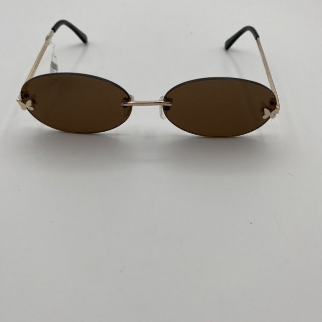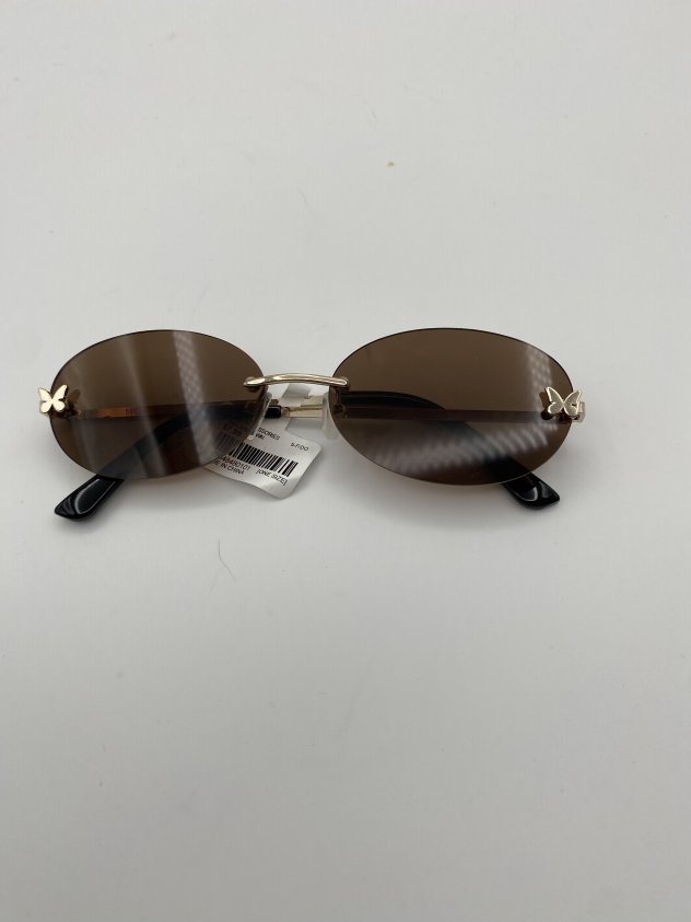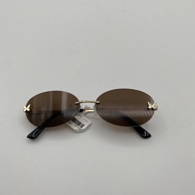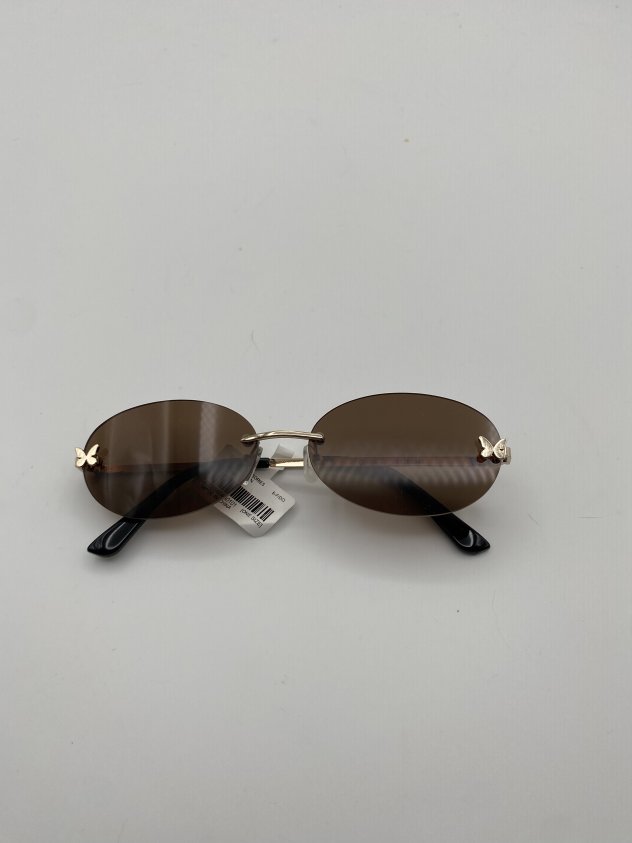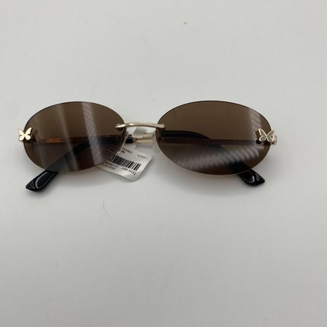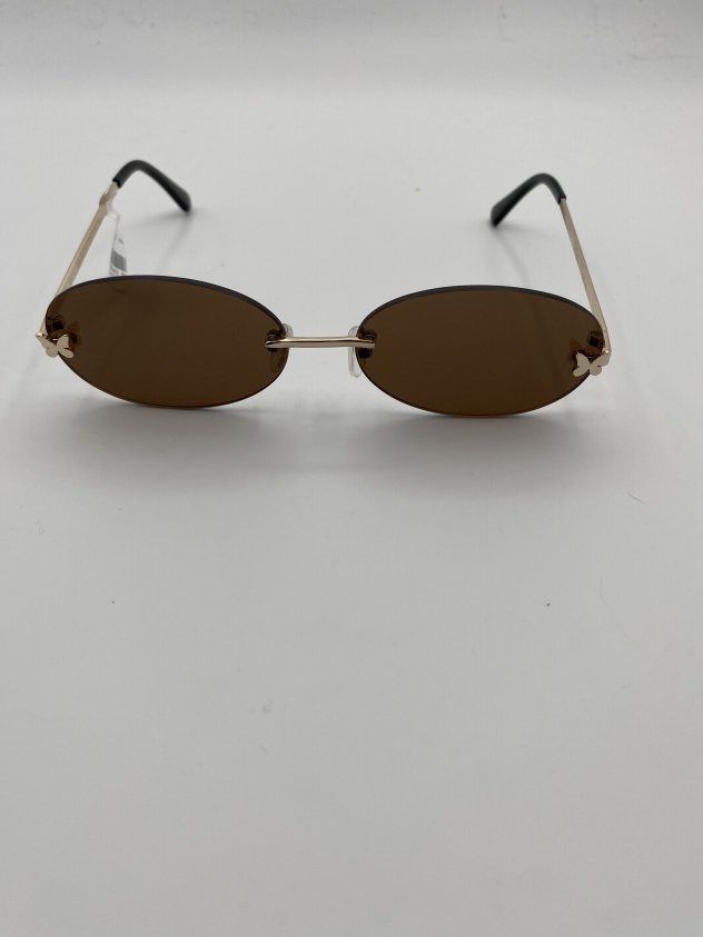 These rimless oval sunglasses feature a sleek minimalist design with brown tinted lenses and decorative gold butterfly details on the sides. Lightweight and comfortable to wear, they offer a trendy Y2K-inspired look that pairs well with casual or dressy outfits. Slim arms and curved bridge design provide a stylish, modern feel. A fun accessory for everyday wear, travel, or photos.