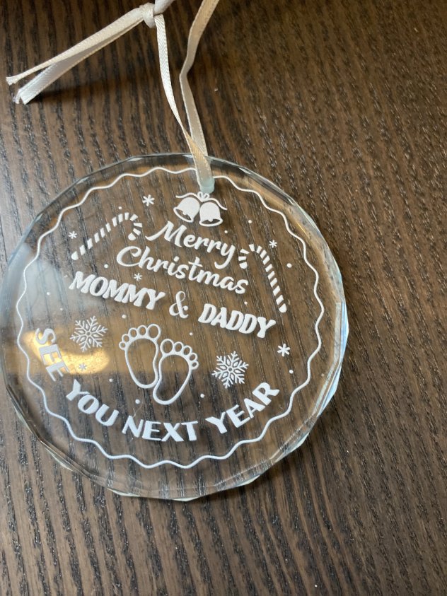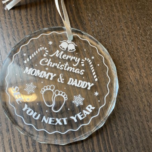 This clear acrylic Christmas ornament features the message “Merry Christmas Mommy & Daddy – See You Next Year” with baby footprints and festive details. Lightweight and ready to hang with ribbon included. A sweet keepsake ornament for the holidays and memory collections. Perfect for Christmas trees, gift add-ons, or seasonal décor.