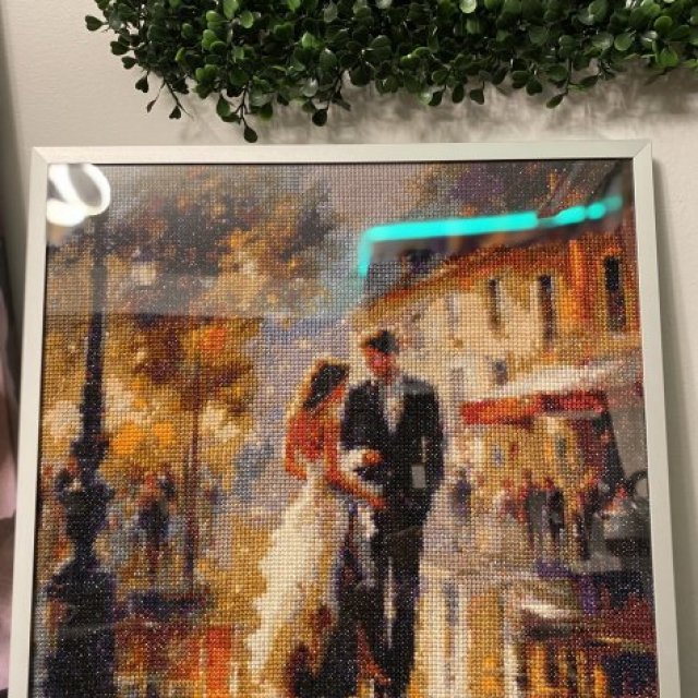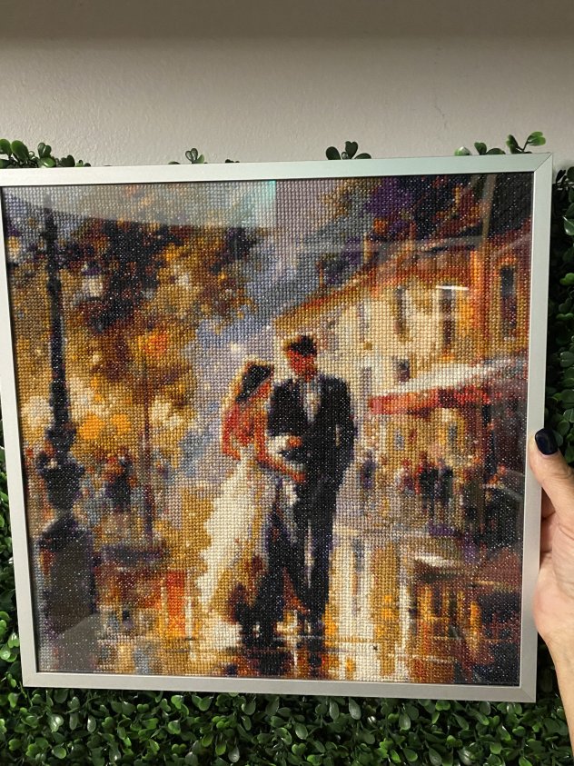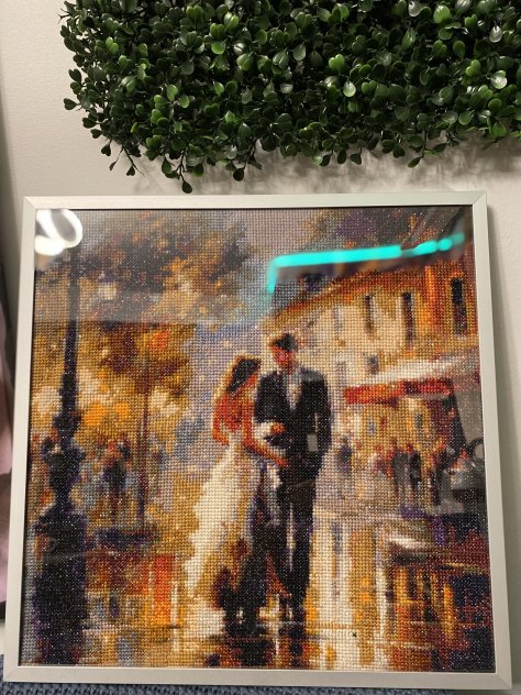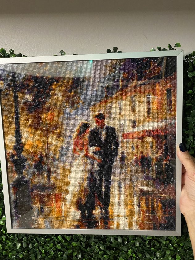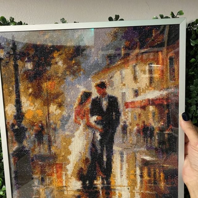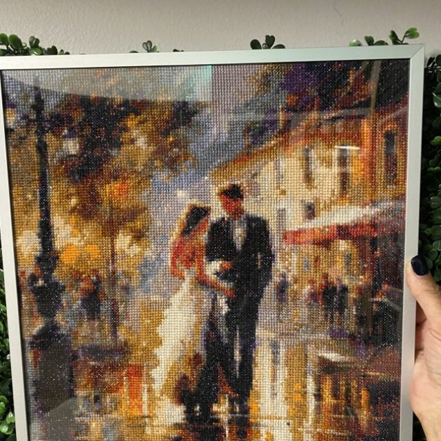 This is a fully handmade cross stitch artwork, carefully stitched with detailed thread work and rich colors. The scene shows a romantic couple walking together through a glowing city street, creating a warm, cozy, and artistic atmosphere.
