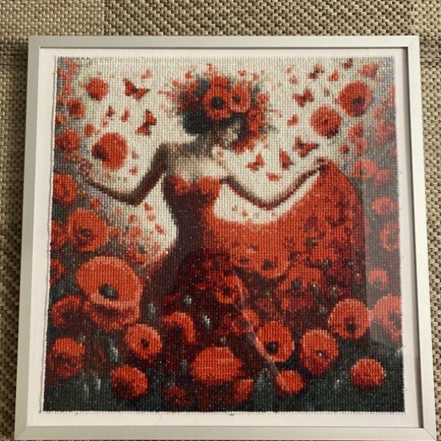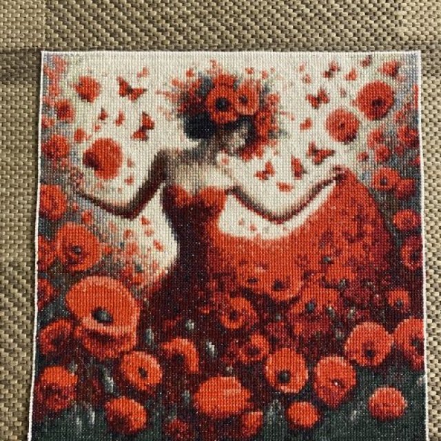 This is a fully handmade cross stitch artwork, stitched with detailed thread work and rich red tones. The design shows a graceful woman in a flowing red dress blending into a field of poppies, creating a bold and artistic look.
