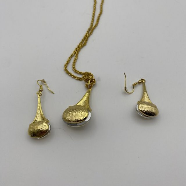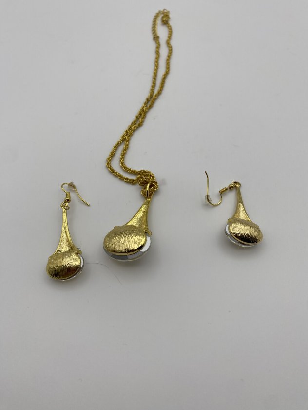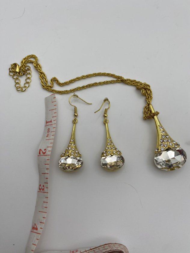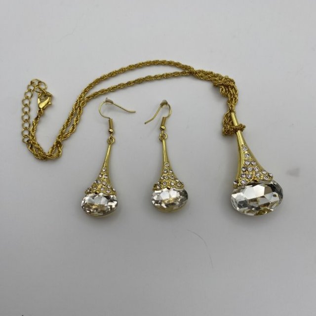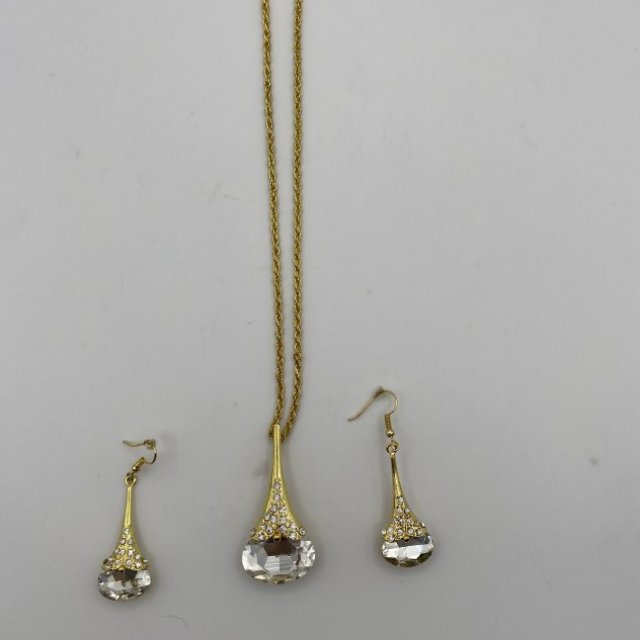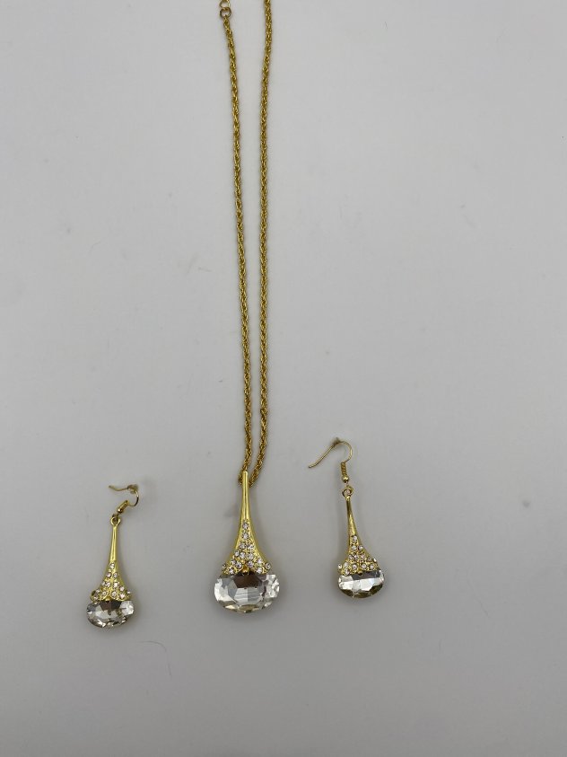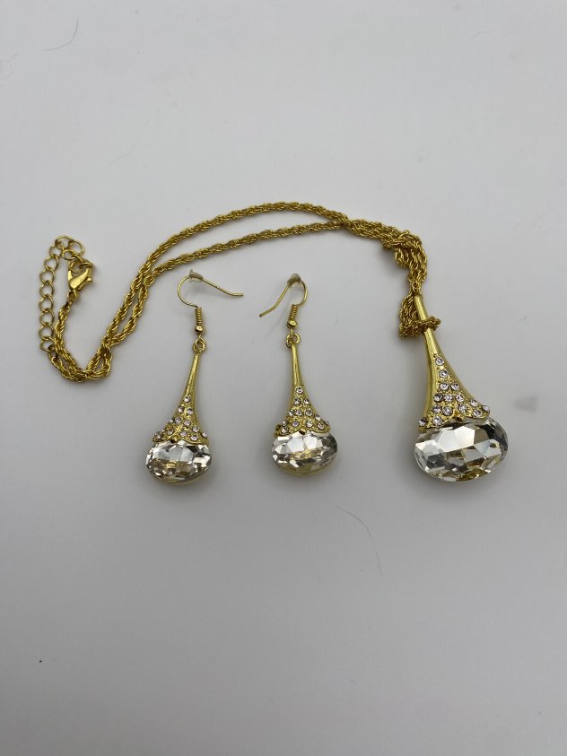 This matching necklace and earrings set features a gold-tone finish with clear, faceted crystal teardrop charms that catch the light beautifully. The pendant and earrings are decorated with small sparkling stones for a classy, dressy look. Great for special occasions, parties, or as a simple elegant gift. Lightweight and comfortable to wear all day or night.