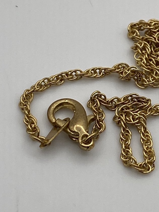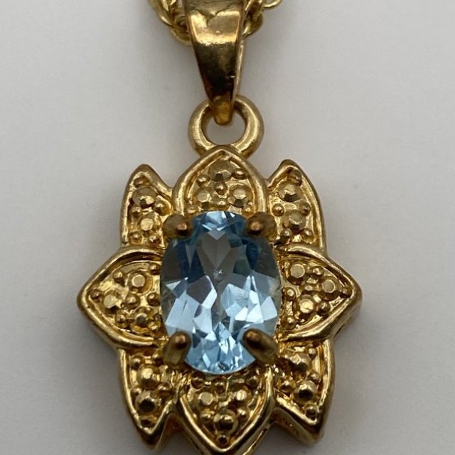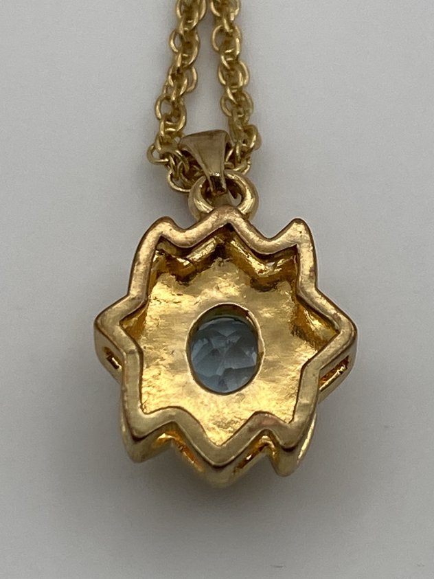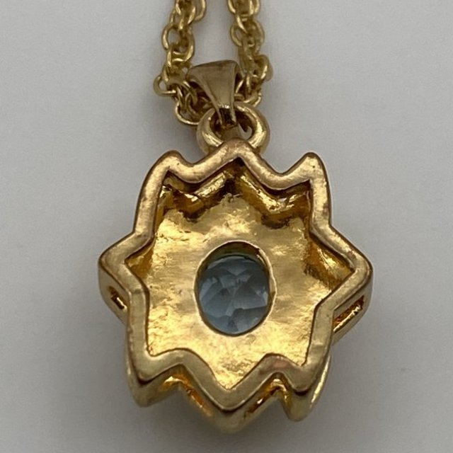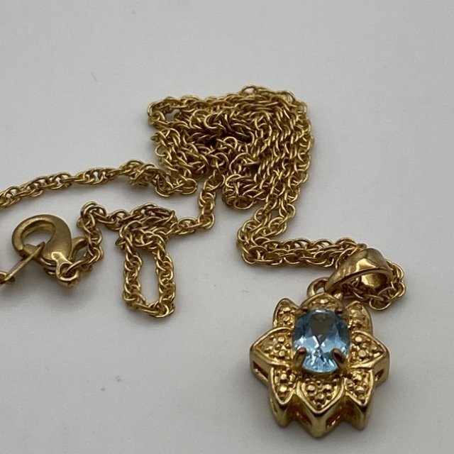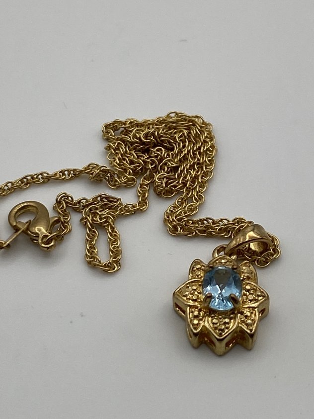 This necklace features a gold-tone chain with a flower-shaped pendant and a light blue stone in the center. It has a classic, elegant look but still works well for everyday wear. The pendant has nice detail and catches the light without being too flashy. Easy to pair with casual outfits or something dressier.