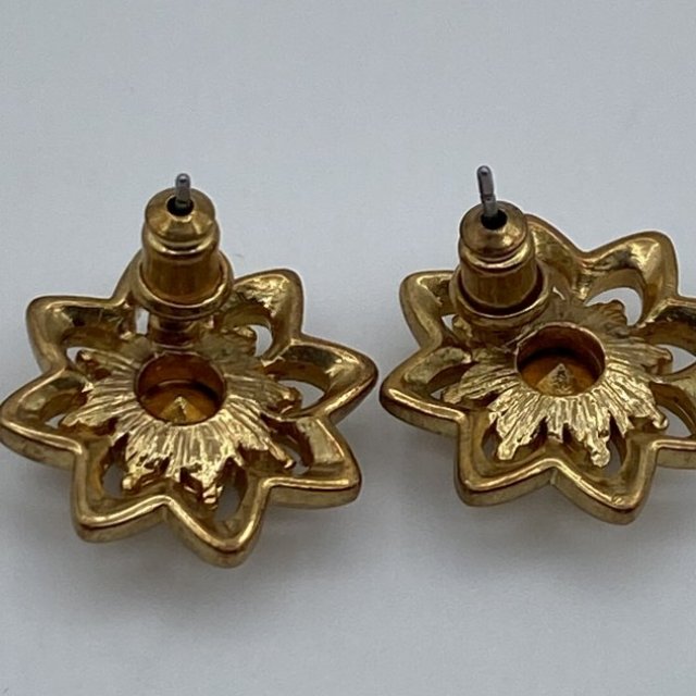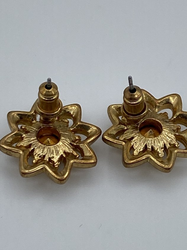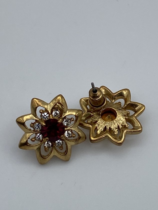 These earrings have a floral design with a deep red stone in the center and small clear stones around it. They are gold-tone and have a classic, slightly vintage look. Not too big, not too small — easy to wear every day or for special occasions. They add a nice pop of color without being over the top.