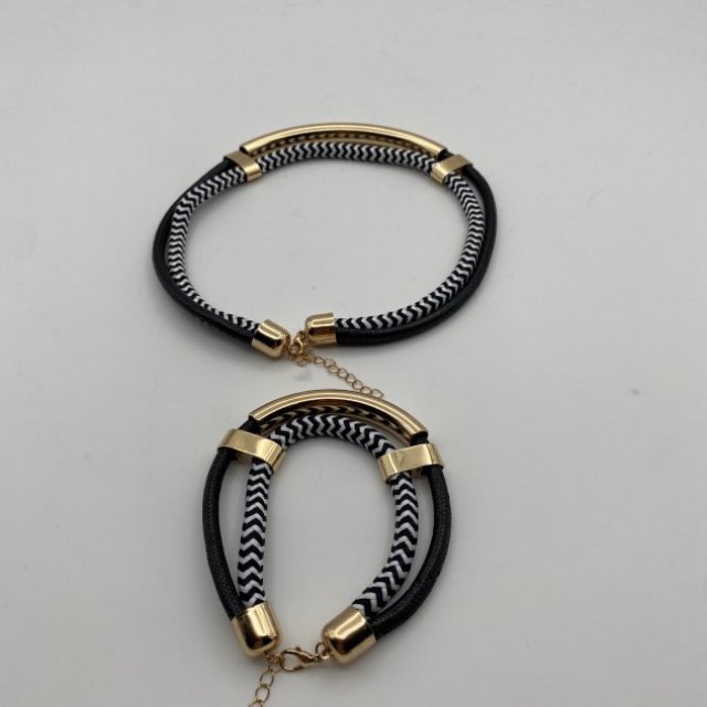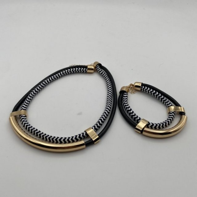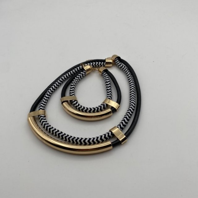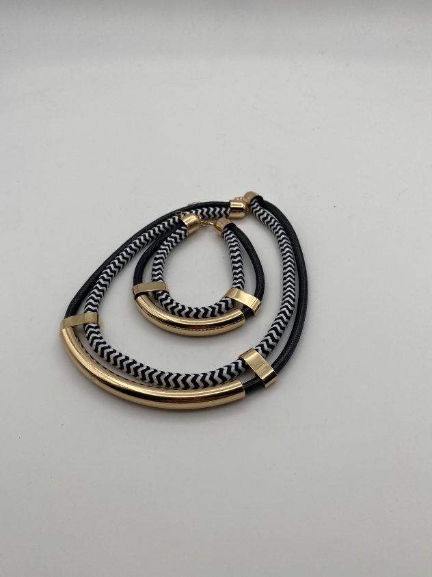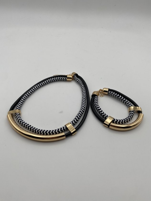 Modern matching necklace and bracelet set featuring black and white braided cords with gold-tone curved bar accents.