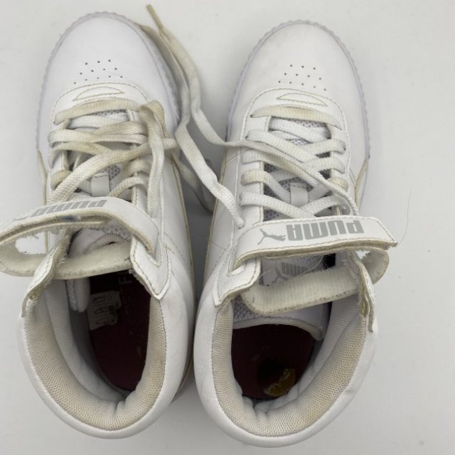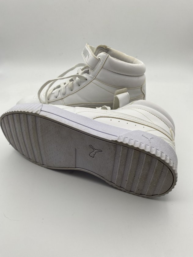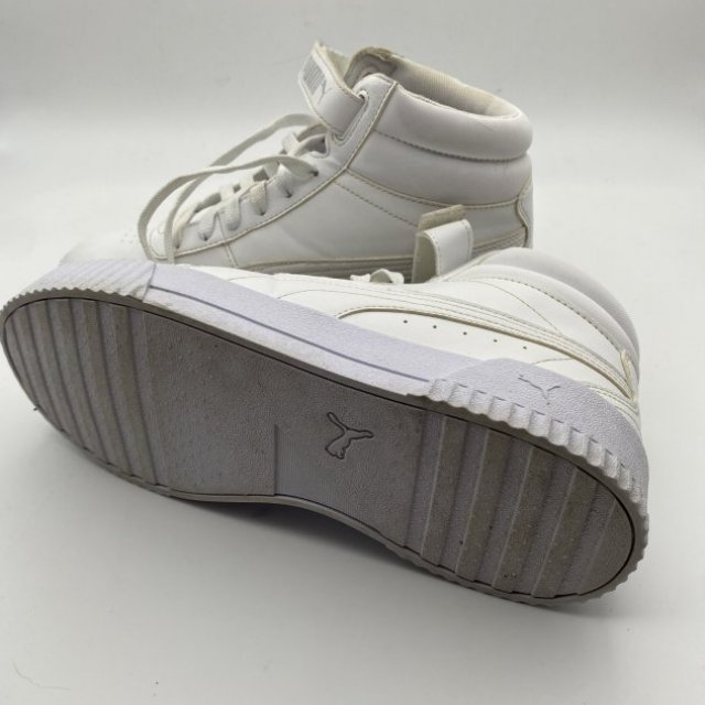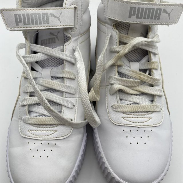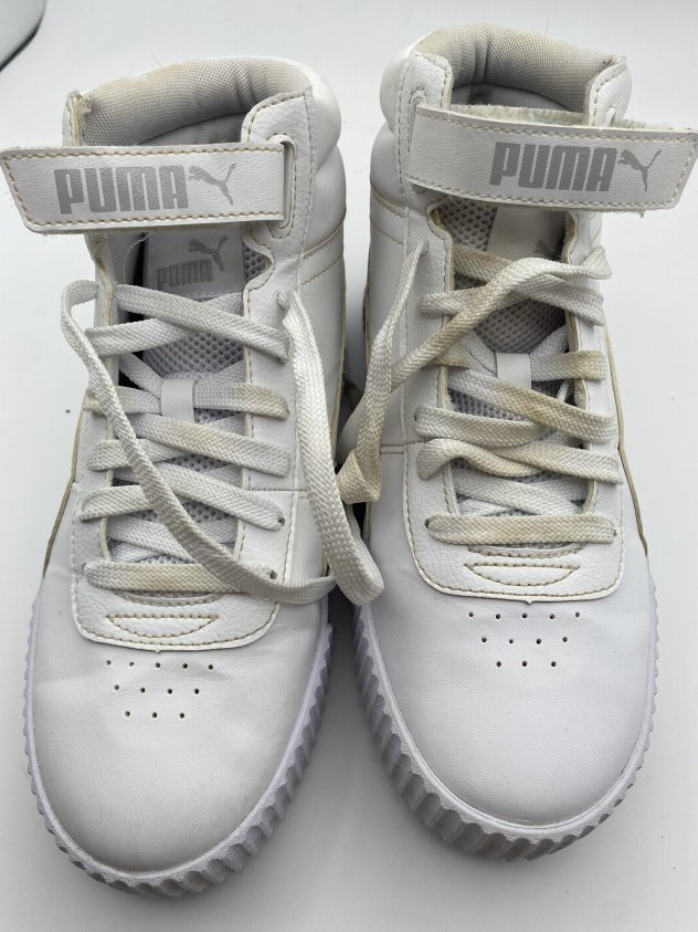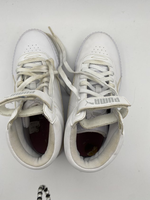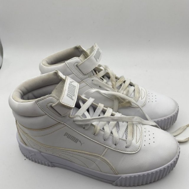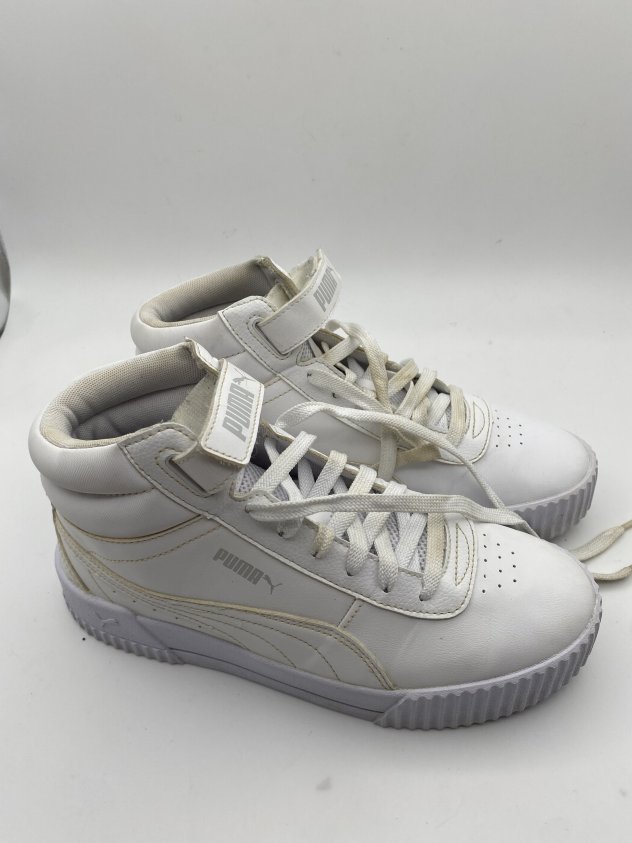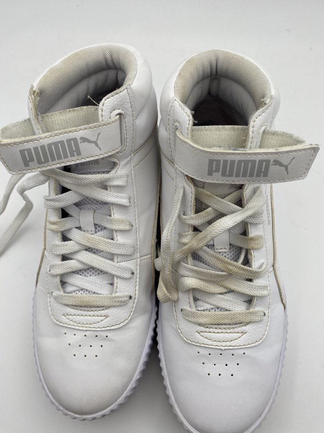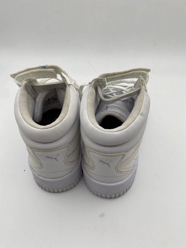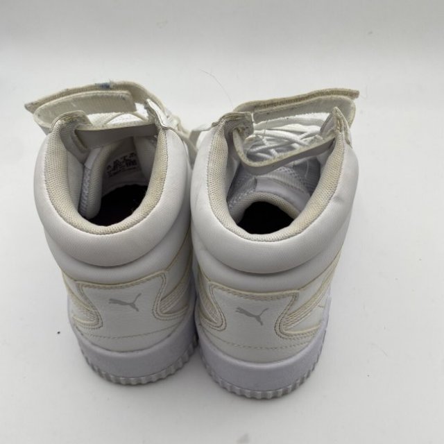 These Puma high-top sneakers feature a clean white design with classic lace-up closure and an added Velcro ankle strap for extra support. The cushioned interior and durable sole make them comfortable for everyday wear. A sporty yet casual style that works well for school, walking, or casual outfits. Ideal for anyone looking for supportive, easy-to-wear sneakers with a timeless look.